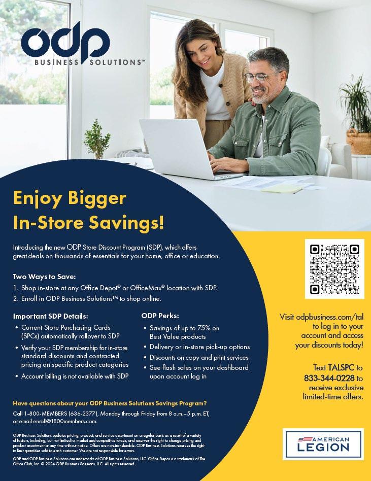 Your TAL (The American Legion) Office Depot® Member Benefits Program, previously Office Depot Business Solutions Division, has been rebranded to ODP Business Solutions™. Now a B2B-focused company serving small, medium and enterprise level companies like yours. You will receive savings of up to 75% on the Best Value List of preferred products with free next-business-day delivery* or in-store and curbside pickup.** To continue to receive your member discounts, you will need to re-enroll or register for an account through our dedicated ODP site.