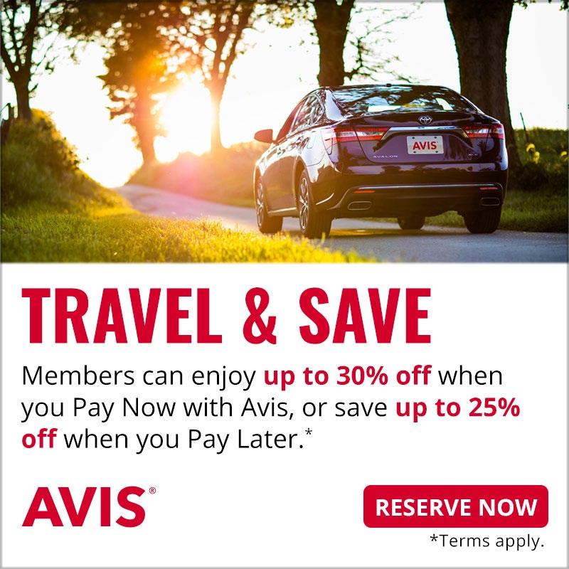 Your next great memory awaits. At Avis, you choose what best fits you and your trip, from the car to the accessories we have you covered. Members can save up to 30% when you Pay Now with Avis, or up to 25% when you Pay Later.