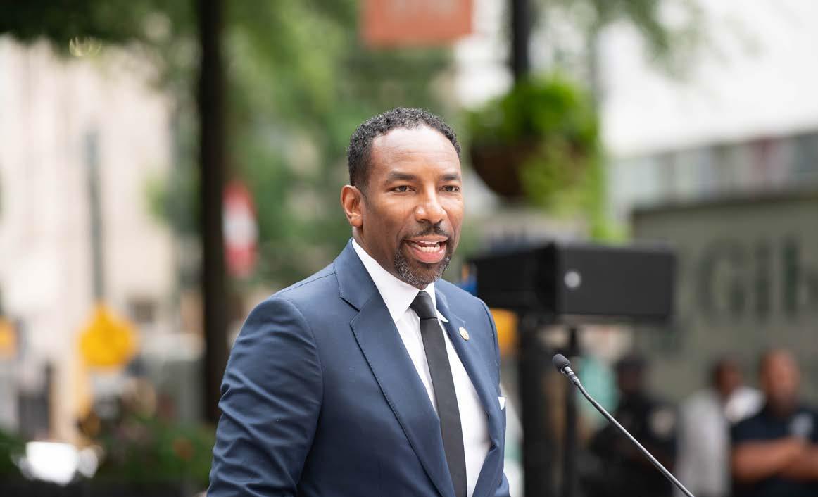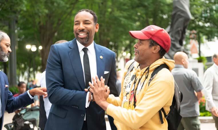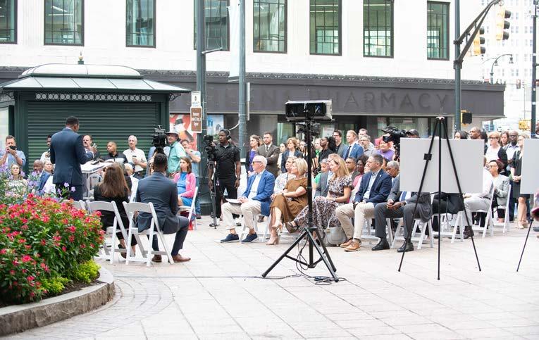 Atlanta Mayor Andre Dickens, Partners for HOME CEO Cathryn Vassell, Georgia State University President Dr. M. Brian Blake, Frank Fernandez of Community Foundation of Greater Atlanta, and members of the Atlanta City Council gathered on the corner of Peachtree Street near Woodruff Park for the special announcement.