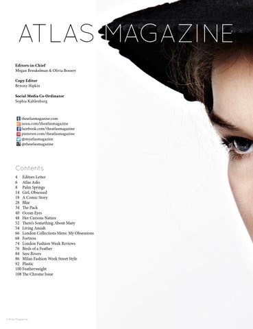 Contents 4 Editors Letter 6 Atlas Asks 8 Palm Springs 14 Girl, Obsessed 18 A Comic Story 28 Blue 34 The Pack 40 Ocean Eyes 48 Her Curious Nature 52 There’s Something About Mary 54 Living Amish 66 London Collections Mens: My Obsessions 68 Fortress 74 London Fashion Week Reviews 76 Birds of a Feather 84 Sere Rivers 86 Milan Fashion Week Street Style 92 Plastic 100 Featherweight 108 The Chrome Issue