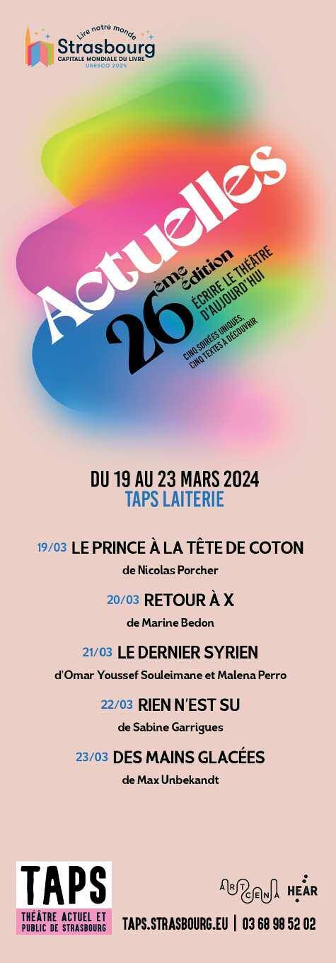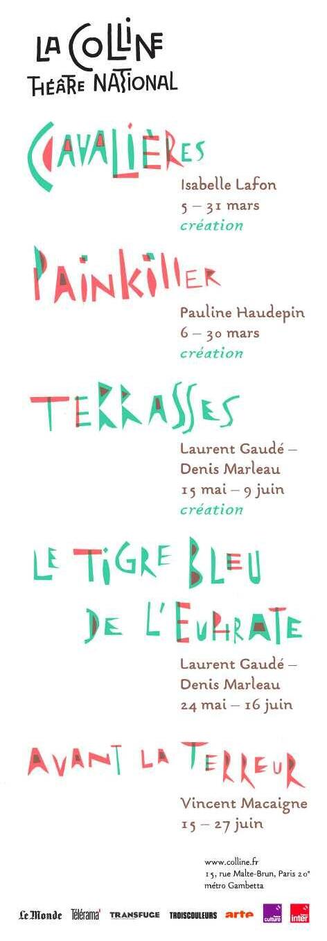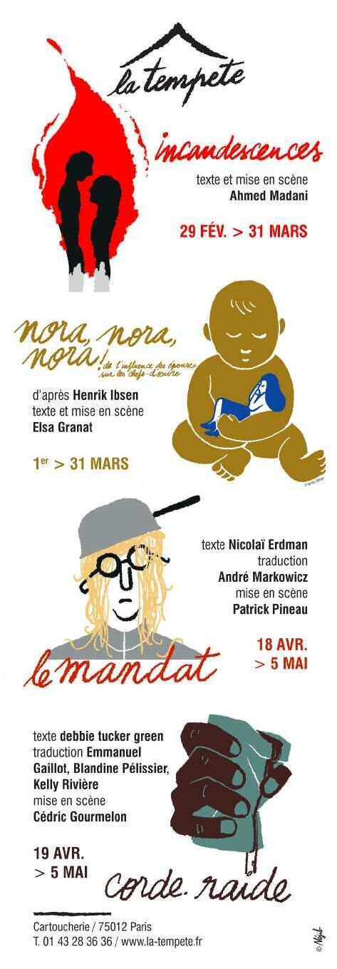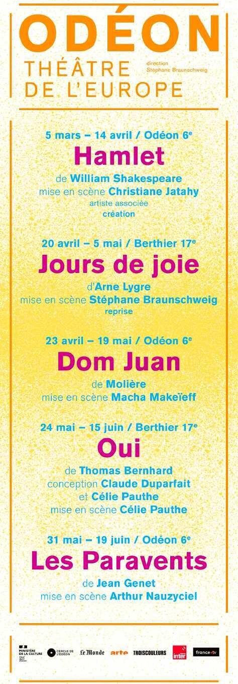 ThéâtredelaCité Toulouse 12-15/03, Célestins Lyon 20-22/03, MC2: Grenoble 2728/03, Théâtre du Nord Lille 4-6/04, Théâtre de Lorient 10-11/04, TNB Rennes 16-19/04, TnBA Bordeaux 14-17/05