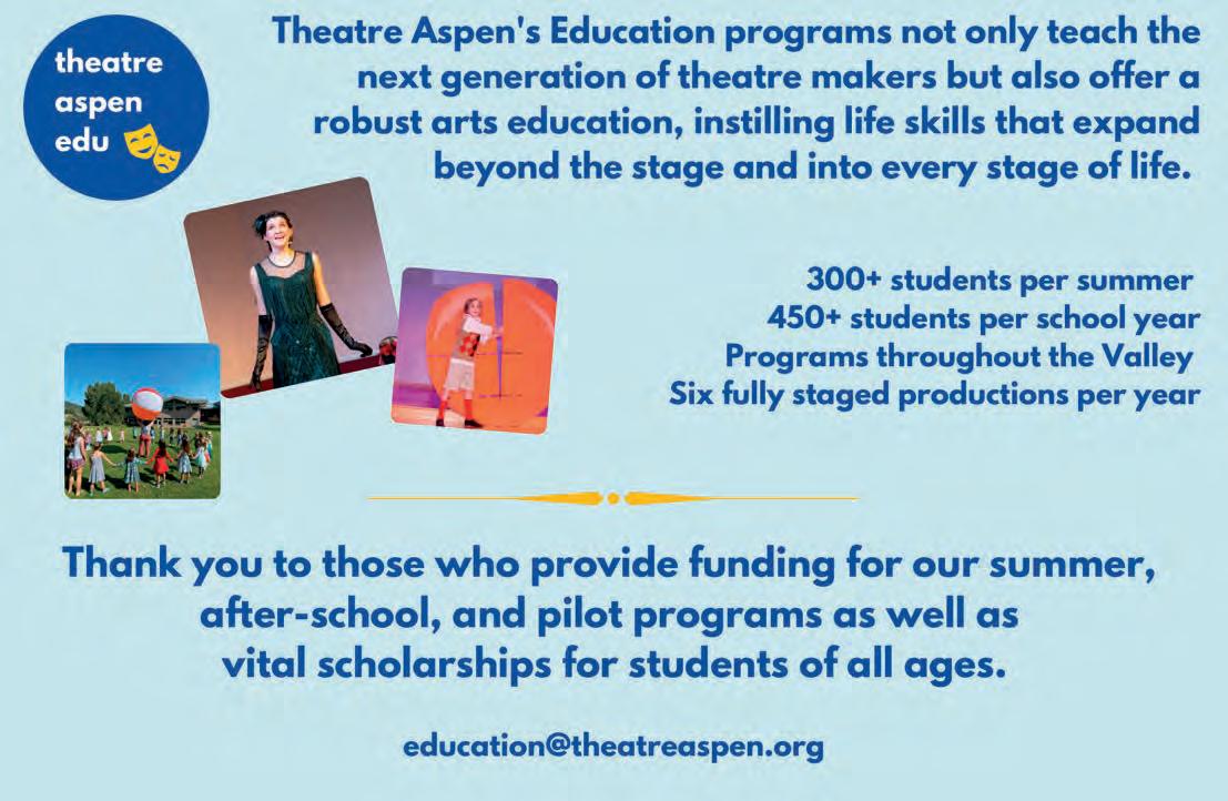 While the theater draws Broadway talent and stars to its stages for buzzy and high-caliber shows—most recently Oscar nominee Judd Hirsch starred in a one-night winter bene t production of Love Letters—Bernstein notes that community-focused programs and educational o erings are among its most important. Last year, Theatre Aspen partnered with the Aspen School District to launch a performing arts curriculum and theater classes for students from fth grade through high school. This year’s expansion to Parachute will make it among the broadest regionalreaching Aspen-based arts o erings for kids.