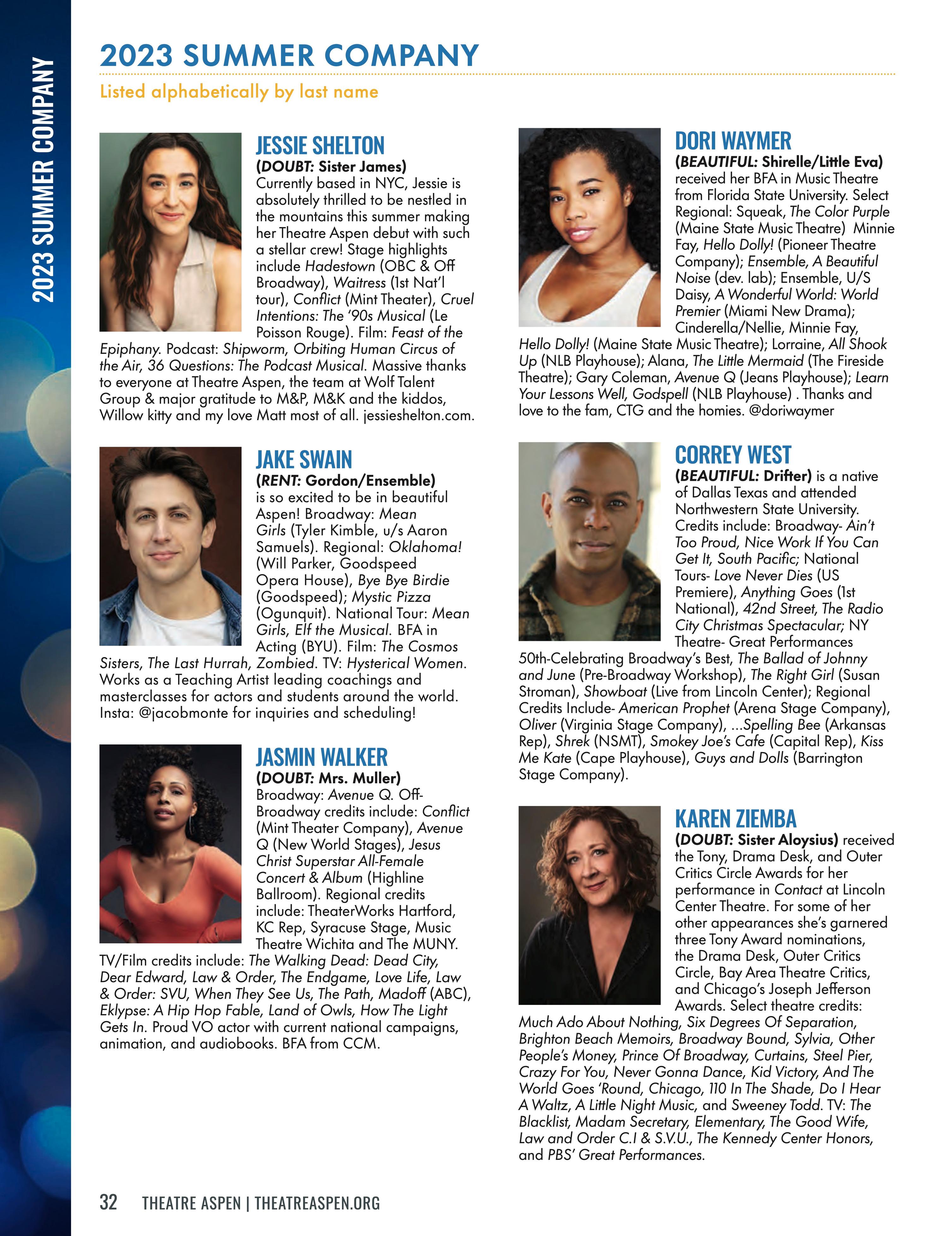 We are very excited about and proud of our summer schedule: “Beautiful,” “Doubt,” and “Rent” will highlight our mainstage performances; three di erent cabaret programs to be enjoyed at the iconic Hotel Jerome; as part of our education program, we will stage three wonderful productions of “The Tempest,” “Shrek,” and “Spelling Bee;” and our 4th annual Solo Flights Festival of one-person shows will close out our season from September 7-14.