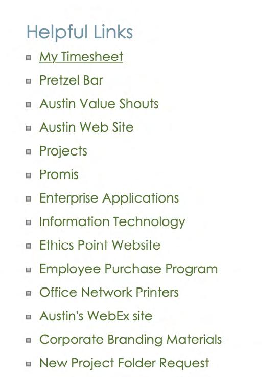 There are numerous tools and files employees must access to help them do their jobs and that provide information related to benefits. Go to theaustin.com and click on Employee Resources in the footer for a list of links to shared resources. Information that all employees need to know—benefits, brand guides, print drivers, and processes and procedures—can be found on Austin Connect.