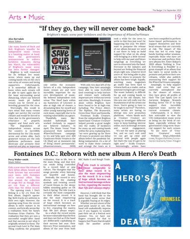 “If they go, they will never come back.” Brighton’s music scene post-lockdown and the importance of #SaveOurVenues Alice Barradale Music Editor Like many lovers of Rock and Roll, Brighton’s ‘standby’ for independent music venues is a haunting matter at hand. Since the government’s announcement to enforce lockdown measures during late March, the vulnerability of Brighton’s music scene has been further damaged. Brighton is well renowned for its brilliant live music scene, where many up and coming bands rely on the city’s vast array of venues and loving supporters. Unfortunately, it is somewhat difficult to know when such venues will be able to open again due to the issue surrounding social distancing, where our beloved sweaty mosh pit fuelled venues can be viewed as a breeding ground for the virus. Worryingly, this would in turn mean that many venues might not survive the current climate and would be forced to close due to the government’s reluctance to properly support and fund such arts. The degradation of independent venues across the country is incredibly detrimental for the UKs music scene and artists alike. Such grassroot venues are the only platforms performers must showcase and promote their material and play an important