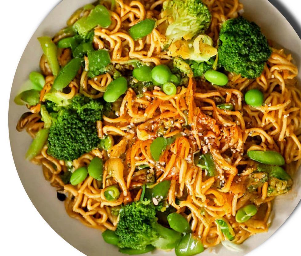 Description: Sweet meets spicy in this tasty Chinese noodle dish topped with edamame and broccoli .