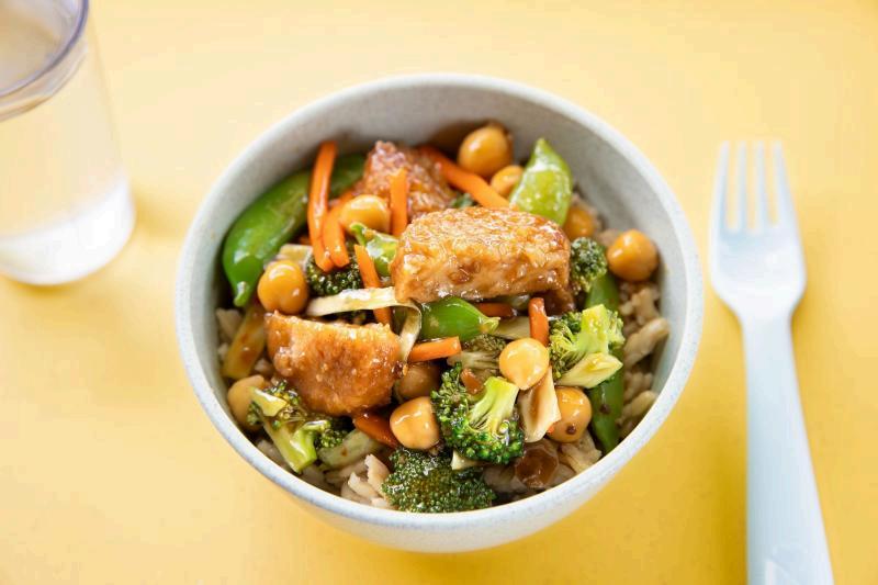 Description: Zesty orange sauce brings bright, bold flavor to this protein-packed bowl with Rebellyous Kickin’ Nuggets or Tenders, chickpeas, snap peas, broccoli, and brown rice