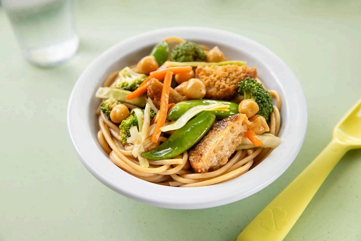 Description: Rebellyous Kickin’ Nuggets or Tenders, chickpeas, broccoli, carrots, and snap peas add protein and plant power to this Asian-inspired noodle dish.