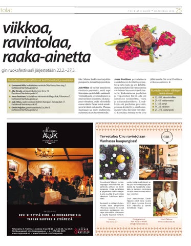 Karttakoodi Vanhakaupunki h2 ■ Juuso Penttinen, historiallinen viiniravintola Magus Auk, Pühavaimu 7. Karttakoodi Vanhakaupunki g2 ■ Jaak Hiibus, uuden virolaisen keittiön Kaerajaan, Raekoja plats 17. Karttakoodi Vanhakaupunki h2 ■ Dmitri Haljukov, gourmetravintola Cru, Viru 8. Karttakoodi Vanhakaupunki h2