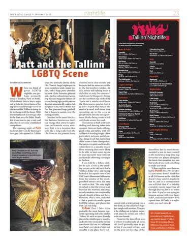 weather, but in a few months will begin to feel far more accessible to the fairweather clubber. As it is, you’re still talking about a club that is only five minutes’ walk from Fat Margaret’s Tower on the northern tip of the Old Town and a similar stroll from the Rotermann quarter, but it is to be hoped that Patt is the start of a trend, with more bars sprouting up in the area as people move into the new apartment blocks being constructed with haste across the road. The interior is built with both chilling and dancing taken into account; there are banks of long, plush sofas and tables, with the addition of standing-height tables particularly welcome and showing a design touch that many older clubs seem to have disregarded. Bar service is quick and friendly, while there is a sizeable dance floor, meaning that you’re likely to be able to bust some moves to your favourite tune without accidentally elbowing a stranger in the face. I was told by a fellow clubber to take a look at the smoking terrace, as he told me it had a “million-dollar view,” and having looked at the superb view of the Old Town’s illuminated silhouette from the window of the woodpanelled terrace area, it’s easy to confirm that. The only slight drawback is that the terrace is, at least for the moment, enclosed, so only smokers can comfortably spend a length of time out there. However, what a view, and what a club; a great city needs a great LGBTQ culture, and places like Patt can only help. X-Baar (Tatari 1, Tallinn b2) is probably the most famous currently-operating club of its kind in Tallinn. It’s such an open, friendly place to be, whether gay or straight, and with every room of the former townhouse laid out in a different way, there’s every kind of night out available in one place. You’re wel-