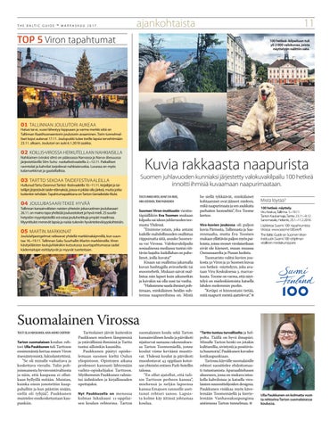 polta. Täällä on hyvä ilmapiiri. Minulle Tarton henki on jotakin kultturellia, sivistystä ja positiivista huumoria”, Paukkunen kuvailee kotikaupunkiaan. Tartossa käyvälle suomalaisille rehtori suosittelee ehdottomasti tutustumista Aparaaditehasen alueeseen, jossa on mukava istuskella kahviloissa ja katsella virolaisten suunnittelijoiden designia. Paukkunen vinkkaa myös kävelemään Toomemäellä ja kiertelemään Vanhassakaupungissa aistimassa Tarton tunnelmaa. ■