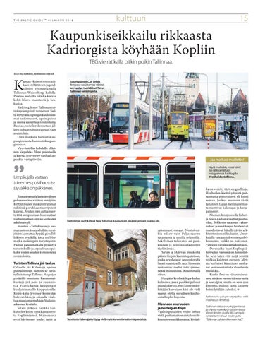 ka on vedelty täyteen graffiteja. Haahuilen kieltokylteistä piittaamatta pistoraiteen yli kohti rantaa. Joskus muinoin tästä tuhannen taalan merimaisemasta nauttivat kalastajat ja karjapaimenet. Niemen länsipuolella Kalurija Süsta-kaduilla vanhat puuhuvilat, Bekkerin sataman rakennukset ja neukkuajan hrutsovkat muodostavat häkellyttävän arkkitehtonisen sillisalaatin. Umpikujalla vastaan tulee mies polvihousuissa, vaikka on pakkanen. Välttelen varoiksi katsekontaktia. Derevjaška-baari Koplin päätepysäkin vieressä on hinnoitellut sekä laten että neljä senttiä vodkaa kahteen euroon. Metrin korkuiset kaiuttimet suoltavat sentimentaalista slaavilaista musiikkia. Koplin ilme on vähän nuhruinen, siinä on mennyttä suuruutta ja nostalgiaa, mutta on vain ajan kysymys, milloin tämä kätketty helmi lyödään rahoiksi. n Raitiovaunu-juttujen sarja jatkuu vielä maaliskuun lehdessä. Tallinnan raitiovaunulinjojen kartat ja ohjeita matkalipun ostoon löydät tämän lehden sivulta 46. Lue myös netistä tammikuun lehden juttu “Tallinnan julkisen liikenteen ABC”.