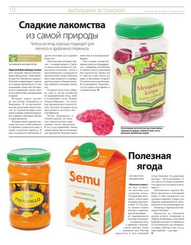 известны и в центральной Европе. Эти сладкие лакомства можно купить в супермаркетах – например, сети Prisma, в Sadama turg и в магазинах био-продуктов. Банка (80 г) чипсов стоит около 4,4 евро, в магазинах Старого Таллинна несколько больше. В ассортименте Таарапыллу есть также сок, варенье и сушеные ягоды. ■
