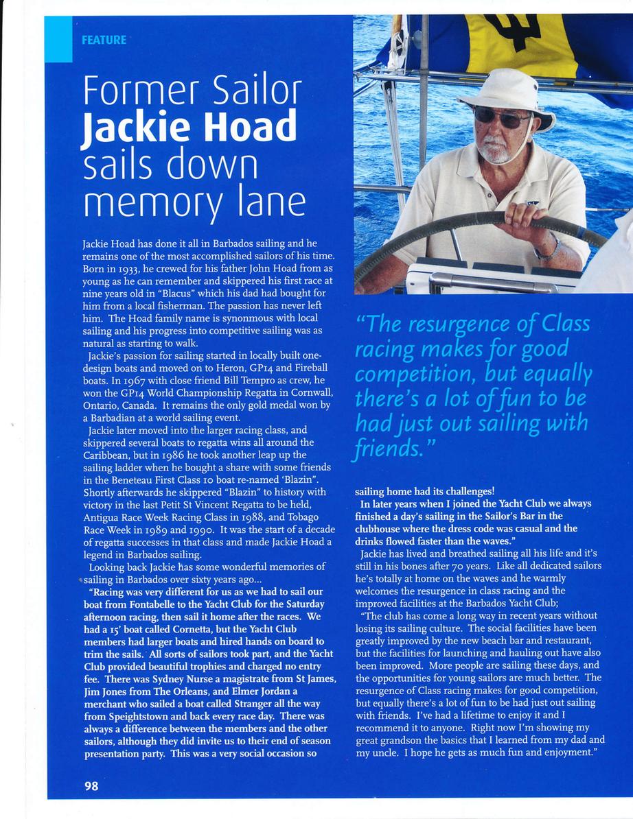 This edition of the Bellbuoy features Jackie Hoad, who was a past Commodore and Trustee of the Club and an avid sailor. We also regret to announce the passing of member David Leacock on Good Friday He was an active member of the Club, playing tennis and swimming every evening with friends. Our condolences to the family of both Jackie and David.