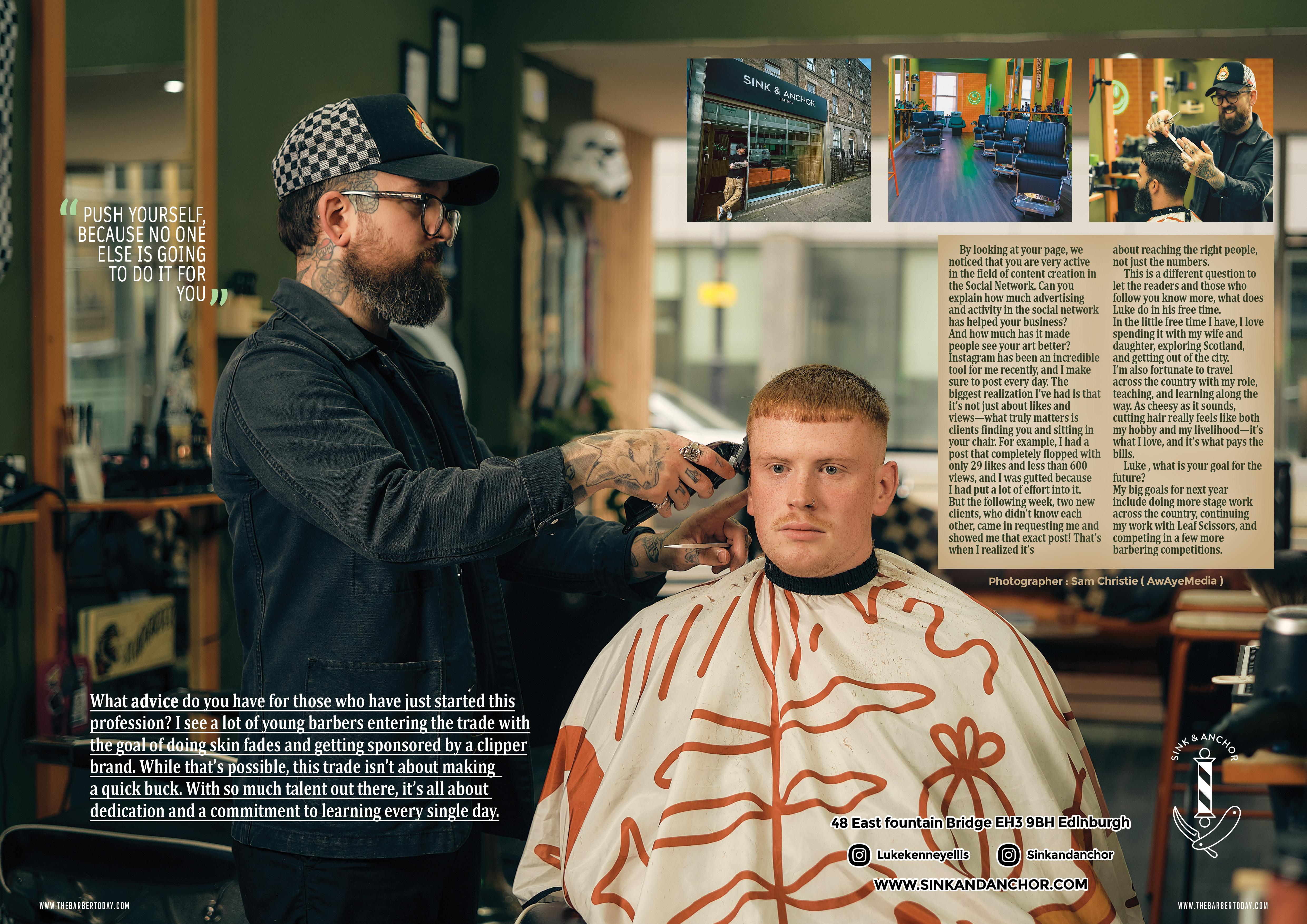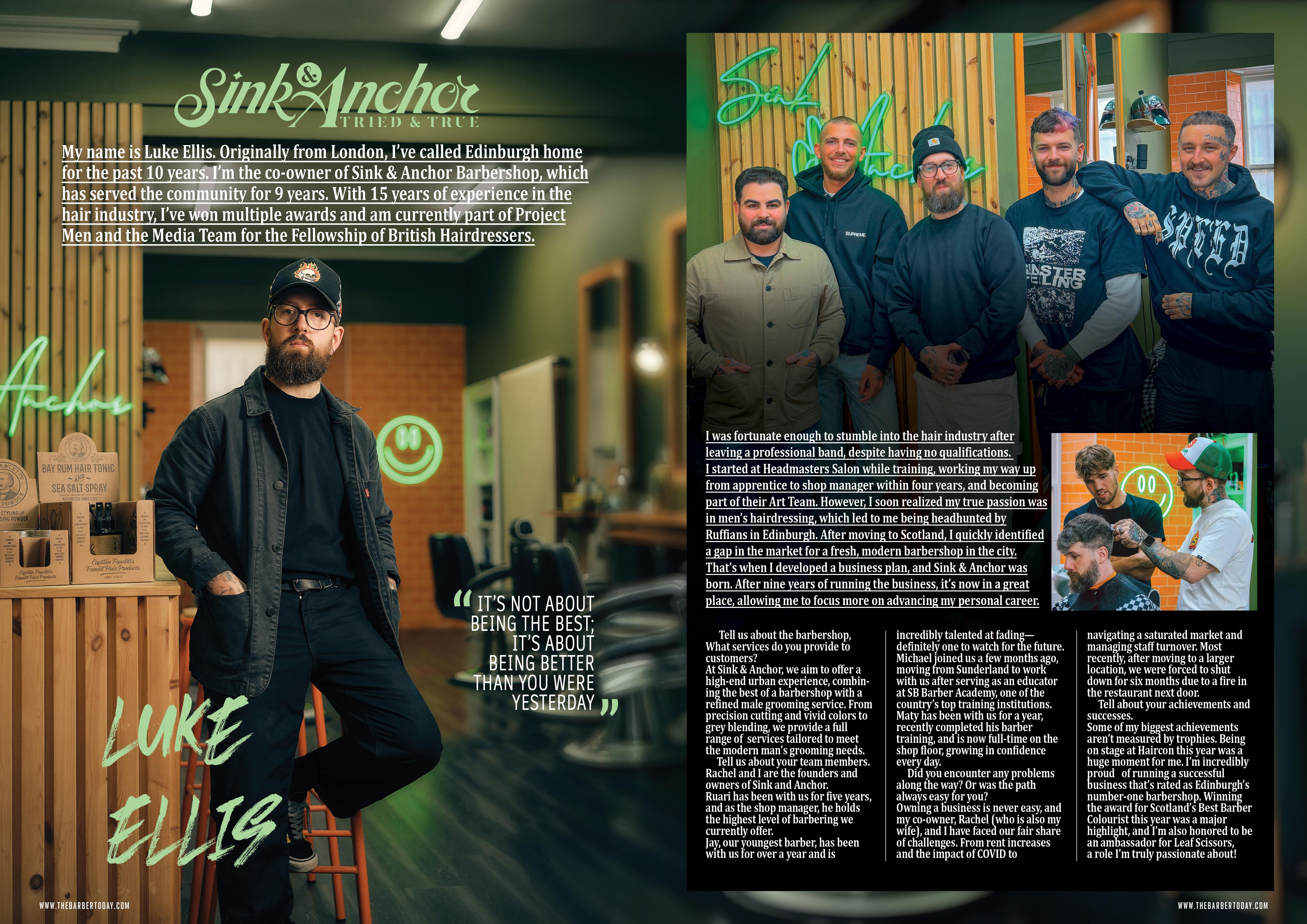My name is Luke Ellis. Originally from London, I’ve called Edinburgh home for the past 10 years. I’m the co-owner of Sink & Anchor Barbershop, which has served the community for 9 years. With 15 years of experience in the hair industry, I’ve won multiple awards and am currently part of Project Men and the Media Team for the Fellowship of British Hairdressers.