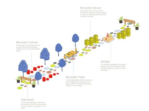 thresholds, props, and the space itself. Four principles for a playscape construction are proposed in response to the nature of play, which aided in proposing a toolkit to guide designers to retrofit public spaces. Rather than suggesting practical solutions for promoting a specific form of play, this project emphasizes the support of adventurous, diverse, and continually changing characteristics which urban public space provides to play. Wan Chai, a dense but dynamic district in Hong Kong is chosen to proceed design application. Playscape not only provides room for uncontrolled and irrational creativity and actions but also helps to spark individuals’ imagination towards the city. In that, this study aims to raise the awareness of urban adult play and provokes further investigation of playscape in different urban contexts.