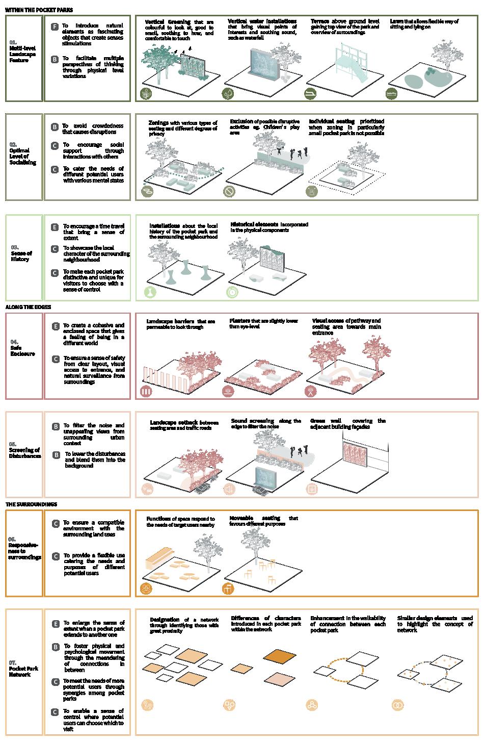 The frst stage of the research aims to explore the characteristics of a stress restorative environment, referring to previous studies between public spaces and mental health, together with reallife examples of parks and gardens. Building on the fndings and analyses, this research project seeks to develop a toolkit that is adaptable to the pocket parks in high-density cities to promote stress restoration. Key design strategies and practical interventions within the park, along the boundaries, and in the surroundings, are delivered. Based on the author’s place-based understanding of the local context of Hong Kong, three pocket parks in Wan Chai are selected as the sites for application. The proposed toolkit has demonstrated the applicability of various design interventions and the possibility of stress restoration in pocket parks.