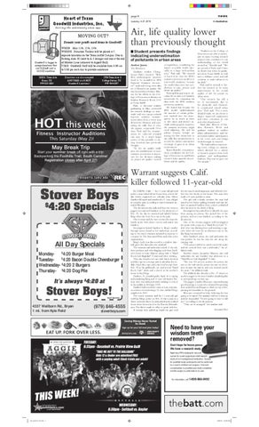 Air, life quality lower than previously thought ■ Student presents findings indicating underestimation of pollutants in urban areas Amber Jaura The Battalion Graduate student Changhyoun Park’s research “Why does anthropogenic isoprene need to be included in EPA National Emission Inventory?” analyzed a long-term data set of Houston air quality. He was honored as a Session Winner for his efforts in the College of Geosciences division in Student Research Week 2010 at Texas A&M. Park, a doctoral student graduating in May, presented his research findings on manmade and tree-canopy-related isoprene emission measurements taken from a tower near downtown Houston and measuring the eddy flux of volatile organic compounds. Over time, Park said the measurements he collected revealed cars may be a much larger source of this naturally occurring chemical than previously thought. “In the air quality study area, the establishment of exact emission inventories is important for the decision making on proper air quality controls
