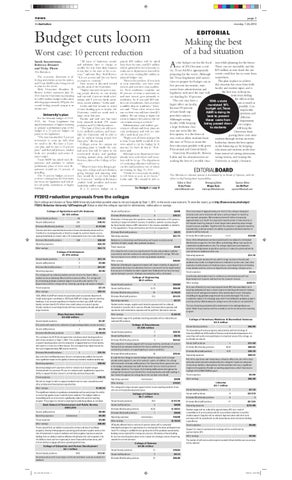 s the budget cuts for the fiscal tion while planning for the future. These cuts are inevitable, and the year of 2012 become a real$39 million in state funds the uniity, Texas A&M is appropriately preparing for the worst. Although versity could lose has to come from the Texas Legislature told univer- somewhere. The plan in place to address sities to prepare for budget cuts in this situation has come from both five percent increments, statefaculty and student input, and is ments from administration and the best way to keep stulegislature indicated the state will dents from feeling cut funding by 10 percent. the effects of the The cuts may have a With a state cuts as much as larger effect on faculty, mandated 10% possible. Cutbecause 89 percent budget cut, Texas ting faculty of state funds supA&M is doing its positions and port their salaries. best to prevent different Although cutting these costs from departments faculty while keeping being passed down on campus a large freshmen class to students will keep the may not seem like the University from best option, it is the lesser of passing these costs onto two evils to allow students from students through tuition increases. the state of Texas to attain the Loftin has chosen the best option best education possible with given in this balancing act by keeping Educational and General funds. education and students in the foreUniversity President R. Bowen front instead of cutting admissions, Loftin and his administration are raising tuition, and treating the making the best of a terrible situa- University as simply a business.