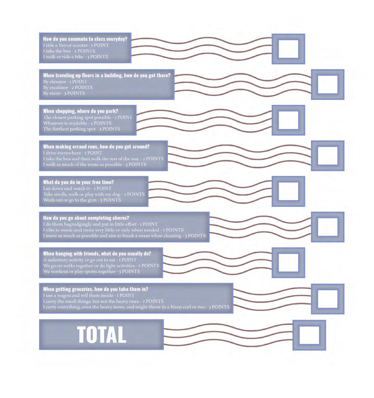 Too much to do and not enough time to do it. Class. Homework. Work. Meetings. Study. Repeat. And by the time the day has ended, you find that all time for self-prioritization has slipped through the cracks and all you want to do is rot in bed and revel in your favorite TV series. Finding time for physical activity and the gym becomes increasingly hard when everyday life becomes more hectic. But, what if I told you, you’re overthinking it? Daily body movement can be incorporated into everyday obligatory activities. Even if you don’t have time for the gym or a workout, it’s important to still be moving your body as much as possible. If you’re not picking up what I’m putting down, keep reading and take this self-assessment to better understand. By the end of this quiz, you should know how you can better squeeze physical activity into your everyday life. If your score is 16 or above,