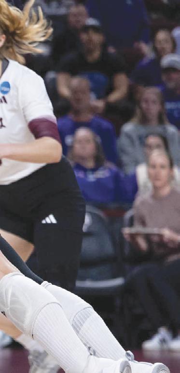 In each of her last 19 games, she has recorded double-digit kills, but almost more impressively, the opposite hitter sits just behind the leading passer, senior libero Ava Underwood, with 275 digs on the season. Whether she’s hitting a ve across court or a D-ball from the back row, watch for her to deliver blows across the net to continue her streak as an explosive o ensive front as she did against then-6-seed TCU to secure A&M’s spot in the Round of 16.