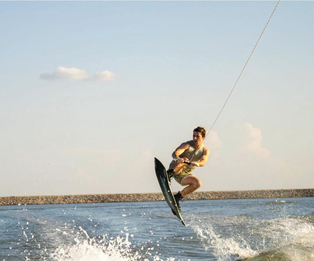 Over the center of the wake, he reached down, grabbed the edge of his board and pulled it close to his body — gaining another foot of clearance. As his board touched back down on the opposite side of the wake, the boat erupted in cheers and praise for the rst-year member.