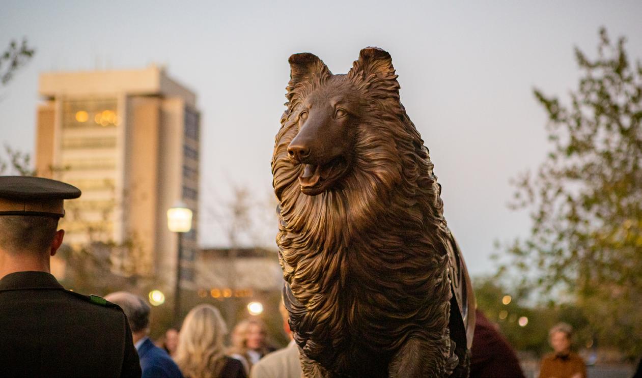 The statue, placed in front of the gravesite of the past Reveilles, was commissioned by a group of former students and their families. Neal Adams, Class of 1968, and Sonja Adams led the process. Neal said the purpose of the statue was to honor both the current and former Reveilles and display their likeness to Kyle Field visitors.