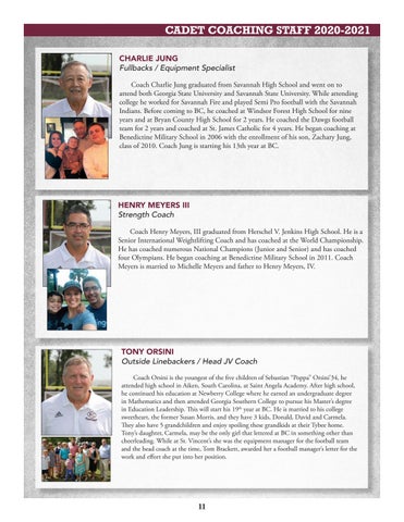 CADET COACHING STAFF 2020-2021 CHARLIE JUNG Fullbacks / Equipment Specialist Coach Charlie Jung graduated from Savannah High School and went on to attend both Georgia State University and Savannah State University. While attending college he worked for Savannah Fire and played Semi Pro football with the Savannah Indians. Before coming to BC, he coached at Windsor Forest High School for nine years and at Bryan County High School for 2 years. He coached the Dawgs football team for 2 years and coached at St. James Catholic for 4 years. He began coaching at Benedictine Military School in 2006 with the enrollment of his son, Zachary Jung, class of 2010. Coach Jung is starting his 13th year at BC.