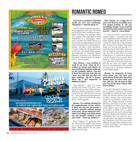 ROMANTIC Romeo If you were a sandwich, what kind would you be? Just wondering, “Stephanie J” Merritt Island, FL Aha! You think I’m going to say something suggestive, don’t you? You’d like me to tell you that I would be an openfaced, foot-long hot sausage sandwich topped with chocolate-covered strawberries in a champagne cream sauce, wouldn’t you? Well, Romeo is a very simple yet sophisticated man and tries to shy away from crass double entendres. My dear, I were a sandwich, I would simply be thinly-sliced prosciutto with a sun-dried tomato spread and tapenade on imported Cypriot flatbread. Surprising, no? Would you like a bite? Hold the pickle. Go ahead, hold it…but be gentle! Dear Romeo, I was sending an email to my lover when all of a sudden my screen went blank! I’m worried that my husband might get on the computer before I can get it fixed first and may look into my “sent” box and find out that I’ve been cheating. My PC is frozen! What can I do? Desperate in Melbourne Beach