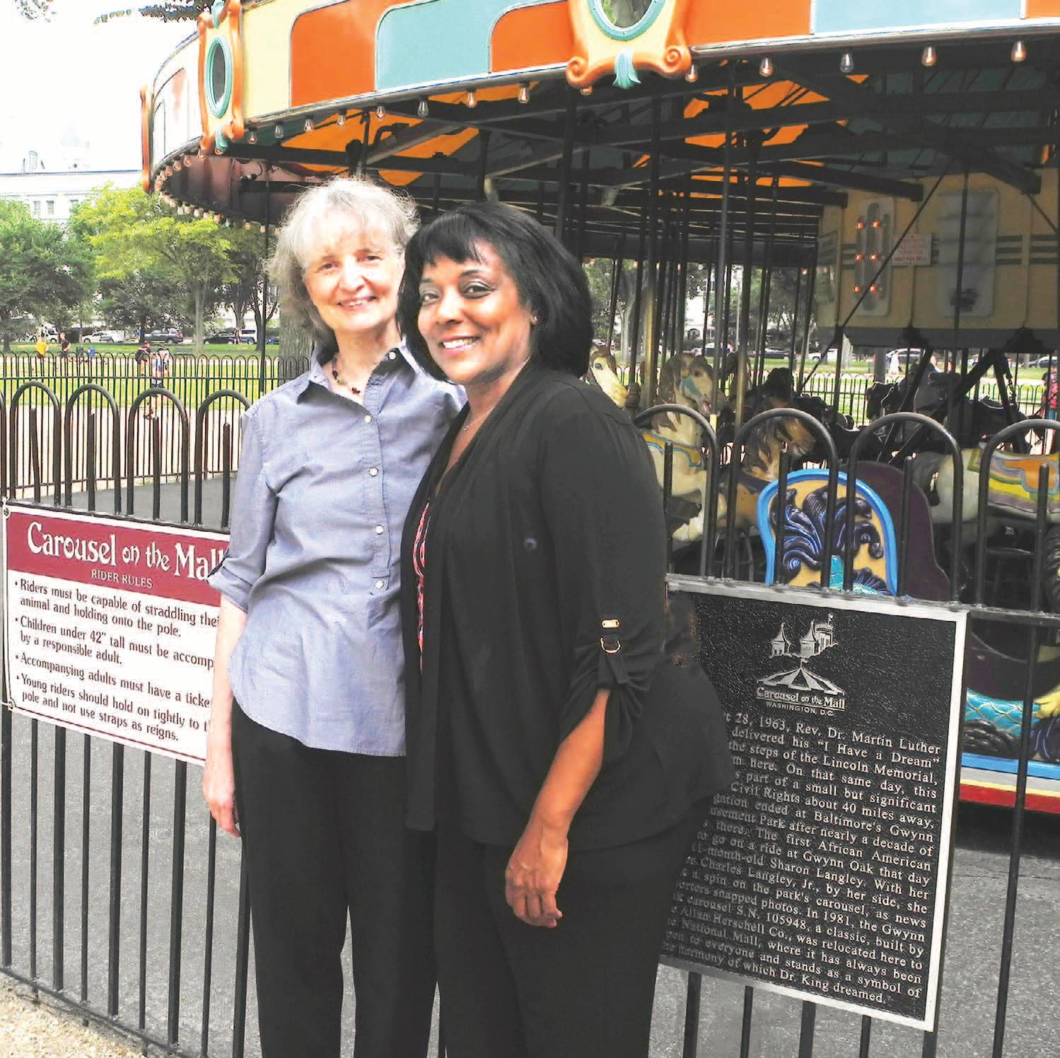 Amy Nathan and Sharon Langley stand in front of a carousel that was once a centerpiece of Gwynn Oak, a whites-only amusement park in Baltimore. The duo published a children’s book about the 1963 desegregation of Gwynn Oak by Langley, the first African American child to ride its carousel, now located on the National Mall in Washington, D.C.