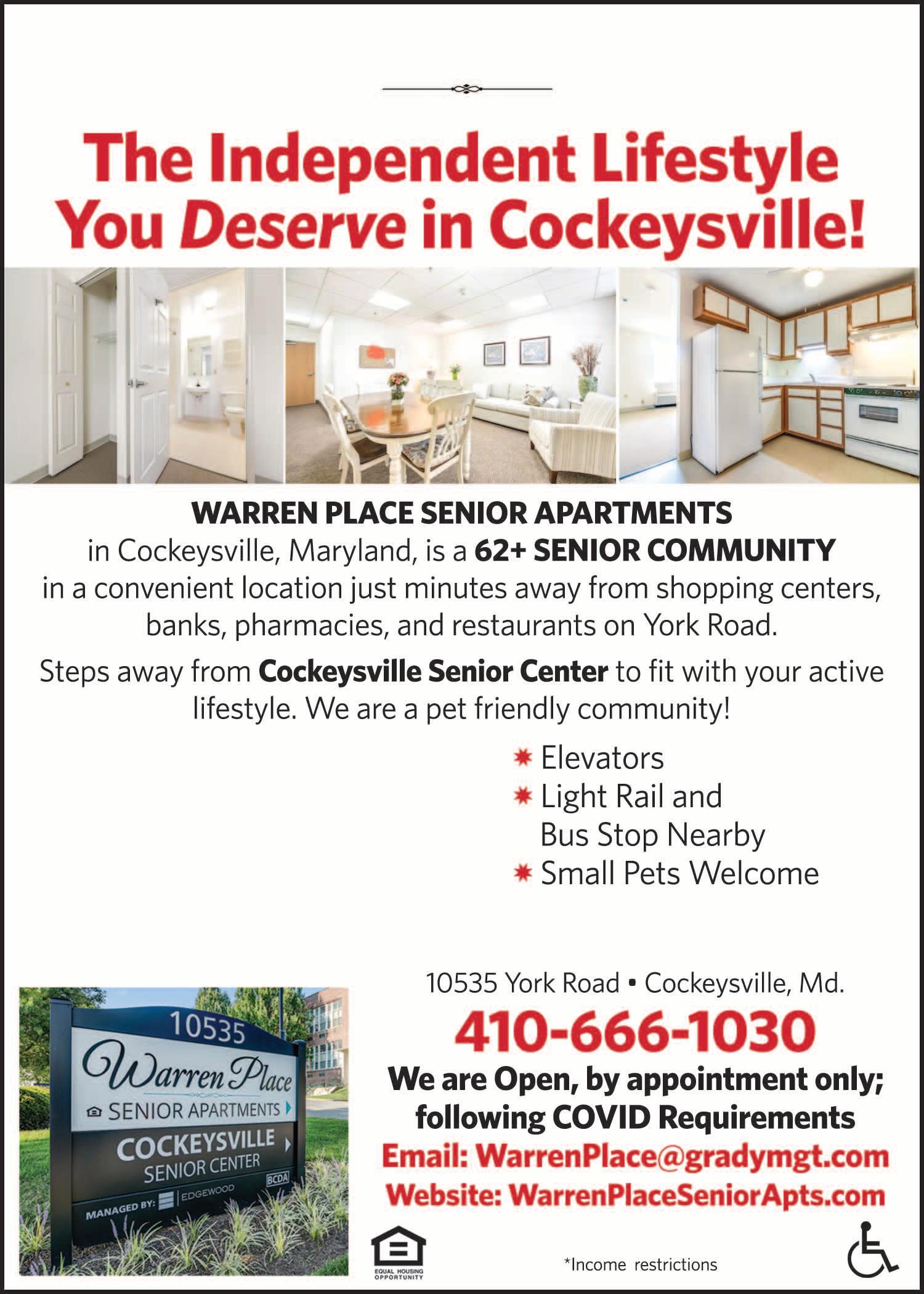Financial For Sale Health Business & Employment Opportunities Caregivers Computer Services Financial Health Home/Handyman Services Home/Handyman Services Miscellaneous Personal Services Legal Services Clinical Research Studies Balance/Falls Study (HIPS) . . . . . .9 Diabetes Diet Study (DASH 4D) . .8 Mild Cognitive Impairment Study . . . . . . . . . . . . . . . . . . . . .9 We Care Advisor . . . . . . . . . . . . . .9 Financial Services Neumeier Consulting . . . . . . . . . .13 Funeral Services Cremation Society of Maryland . . . . . . . . . . . . . . . . . .7 MacNabb Funeral Home . . . . . . . .7 Health Apex Neuropathy . . . . . . . . . . . . . .7 Richard Rosenblatt DPM . . . . . . . .6 Home Health Care/ Companion Services Ennoble Care . . . . . . . . . . . . . . .B-7 Family & Nursing Care . . . . . . .B-6 Housing Brightview Senior Living . .B-4, B-8 Caritas House Assisted Living . .B-4 Catholic Charities Communities .B-4 Charlestown/Erickson . . . .B-2, B-8 Christ Church Harbor Apts . . . .B-6 Enterprise Residential . . . . . . . . .14 Everall Gardens . . . . . . . . . . . . .B-7 Harmony at Enterprise . . . . . .4, B-8 Kessler Park . . . . . . . . . . . . . . . .B-7 Oak Crest/Erickson . . . . . .B-2, B-8 Park View Apartments . . . . . . . . .14 Pickersgill . . . . . . . . . . . . . . . . . . .6 St. Mary’s Roland View Towers . . . . . . . . . . . . . . . .6 Virginia Towers . . . . . . . . . . . . . . .8 Warren Place Apts. . . . . . . . . . . . . .8 Westminster Canterbury . . B-3, B-8 Legal Services D’Amore Personal Injury Law . . . .3 Retail Jacuzzi Bath Remodel . . . . . . . . .20 Radio Flea Market . . . . . . . . . . . .13 Senior Resources Maryland Relay . . . . . . . . . . . . . .10 Skilled Nursing & Rehabilitation St. Elizabeth Rehab/Nursing . . .B-4 Subscriptions Beacon Newspapers . . . . . . . . . . .18 Technology Computer Doctors, The . . . . . . . . .5 Theater/Entertainment Gordon Center . . . . . . . . . . . . . . .16 JMoreLiving.com . . . . . . . . . . . . .12 Toby’s Dinner Theatre . . . . . . . . .16 Travel Eyre Tour & Travel . . . . . . . . . . . .17 Jersey Cape . . . . . . . . . . . . . . . . .17 Smith Island Cruises . . . . . . . . . .17 Superior Tours . . . . . . . . . . . . . . .13 We thank our advertisers who make our publication possible. Please patronize them and let them know you saw their ad in the Beacon. Classifieds cont. on p. 16.