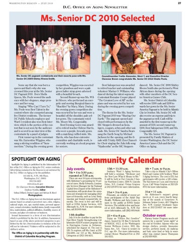SPOTLIGHT ON AGING Spotlight On Aging is published by the Information Office of the D.C. Office on Aging for D.C. senior residents. Advertising contained in the Beacon is not endorsed by the D.C. Office on Aging or by the publisher. 441 4th St., N.W., 9th Floor, Washington, D.C. 20001 202-724-5622 www.dcoa.dc.gov Dr. Clarence Brown, Executive Director Darlene Nowlin, Editor Selma Dillard, Darius Logan and Adrian R. Reed Photographers The D.C. Office on Aging does not discriminate against anyone based on actual or perceived: race, color, religion, national origin, sex, age, marital status, personal appearance, sexual orientation, familial status, family responsibilities, matriculation, political affiliation, disability, source of income, and place of residence or business. Sexual harassment is a form of sex discrimination which is prohibited by the Act. In addition, harassment based on any of the above protected categories is prohibited by the Act. Discrimination in violation of the Act will not be tolerated. Violators will be subjected to disciplinary action.