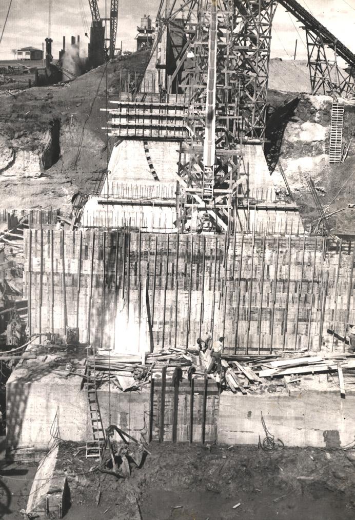 Workers are dwarfed by the scale of the Mathis Dam during construction in the 1930s.