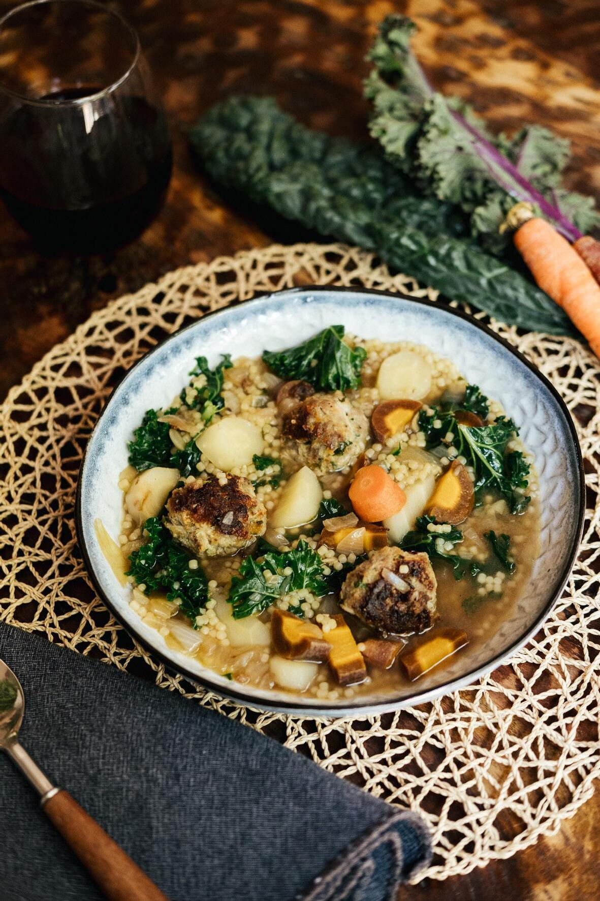 Add 1 tbsp olive oil to the same pot. Add onions and carrots and sauté for 3 minutes. Add garlic and cook for another minute. Finally, add greens, pasta, chicken stock, salt and pepper to the pot, increasing the heat to high until mixture reaches a rolling boil, about 5 minutes. Spoon in reserved meatballs and decrease heat to a simmer, low-medium.