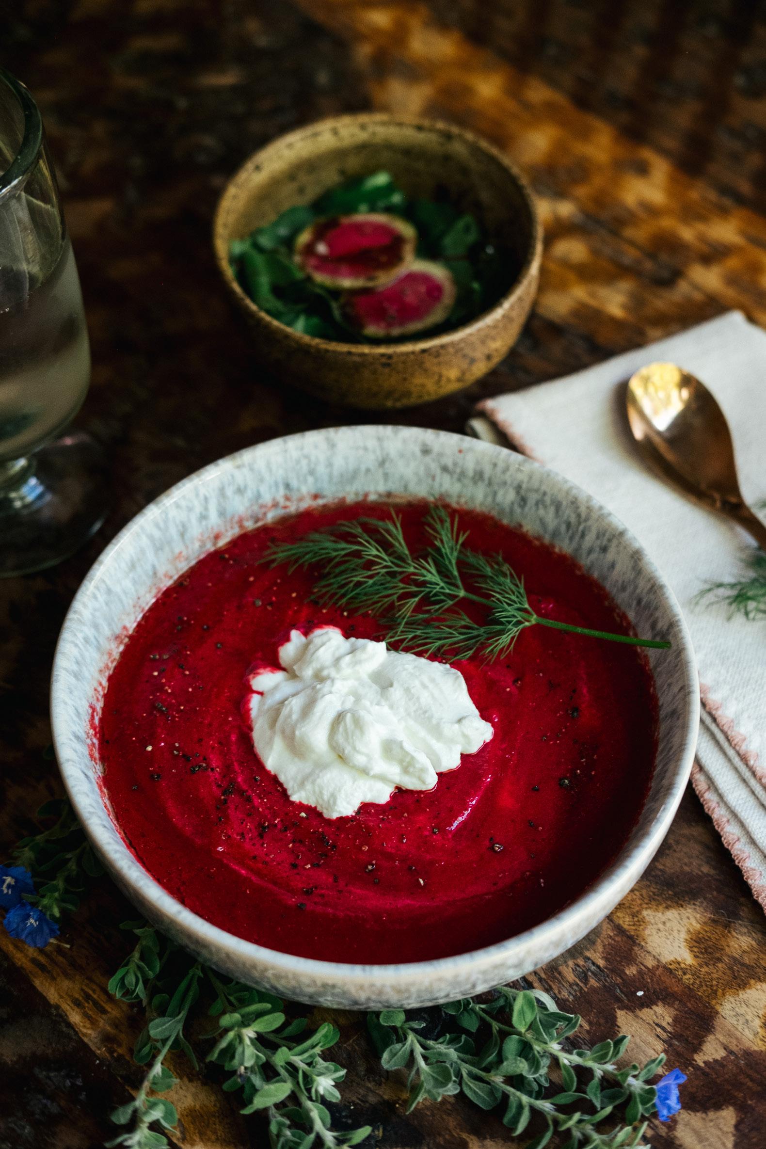 Working in batches, puree mixture until smooth using an immersion or standing blender. Serve with fresh dill and a dollop of sour cream/Greek yogurt.