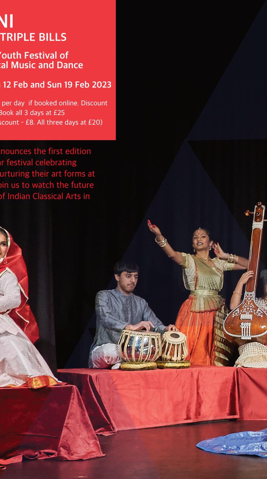TheBhavanannouncesthefirstedition ofaspectacularfestivalcelebrating youngtalentnurturingtheirartformsat TheBhavan.Joinustowatchthefuture torchbearersofIndianClassicalArtsin theUK. TRIVENI 3DAYSOFTRIPLEBILLS TheBhavanYouthFestivalof IndianClassicalMusicandDance Sat11Feb,Sun12FebandSun19Feb2023 4.30pm|£12(£10perdayifbookedonline.Discount codeBHAVAN50)Bookall3daysat£25 (youngperson’sdiscount£8.Allthreedaysat£20) DAY1 Sat11FebNORTHINDIANMUSIC Featuringseniordisciplesof Hindustanivocal,Sitar,andTabla HINDUSTANIVOCALChiraagAgarwal, GauravUniyal,ShayonimaGhosh,PramodiniV Nayak.TrainedbyresidentGuruSmt. ChandrimaMisra SITARSujayaMatthews,SaniChawla, NaveenKaiser,CarolineMacedoGuandalin. TrainedbyresidentGuruSriSanjayGuha TABLADhanrajPersaud,Deeptarka Mukherjee,SoumyarajDas,Madhavi Natarajan,AAmeyaNarkhede,Amey Neerukonda,ManavGadepalli,AaditJhureley, SiddhantRana,SriramGanti,Akshay Sivaloganathan,NeilPuthur.Trainedby residentGuruPt.RajkumarMisra TheBhavan Lond o n 05 Y a rs o f CreatingCulturalLegacies
