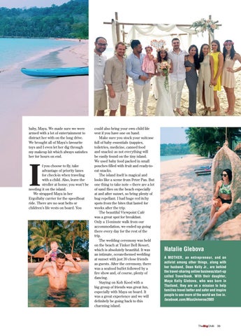 could also bring your own child life vest if you have one on hand. Make sure you stock your suitcase full of baby essentials (nappies, toiletries, medicine, canned food and snacks) as not everything will be easily found on the tiny island. We used baby food packed in small pouches filled with fruit and ready-toeat snacks. The island itself is magical and looks like a scene from Peter Pan. But one thing to take note – there are a lot of sand flies on the beach especially at and after sunset, so bring plenty of bug repellant. I had huge red itchy spots from the bites that lasted for weeks after the trip. The beautiful Viewpoint Café was a great spot for breakfast. Only a 15-minute walk from our accommodation, we ended up going there every day for the rest of the trip. The wedding ceremony was held on the beach at Tinker Bell Resort, which is absolutely beautiful. It was an intimate, ocean-themed wedding at sunset with just 30 close friends as guests. After the ceremony, there was a seafood buffet followed by a fire show and, of course, plenty of dancing. Staying on Koh Kood with a big group of friends was great fun, especially with Maya on board. It was a great experience and we will definitely be going back to this charming island.