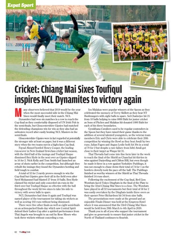 any observers believed that 2019 would be the year when the most successful side in the Chiang Mai Sixes would finally meet their match. NCL Dynamites had won six matches in a row to reach the Cup final as they comfortably disposed of UN Irish Pub in the semi-finals, but Gloucestershire Gipsies had matched the defending champions win for win as they also had an unbeaten record after easily beating NCL Masters in the semi-finals. Gloucestershire Gipsies were in fact regarded at potentially the stronger side at least on paper, but it was a different story when the two teams met in a high-class Cup final. Faysal Ahmed bowled Henry Cooper, the leading run-scorer in New Zealand first-class cricket last season, with the third ball of the innings and Toufiqul Haque dismissed Ben Hyde in the next over as Gipsies slipped to 16 for 2. Nick Kelly and Tom Smith had launched an array of shots earlier in the competition, but although they rebuilt the innings they found the Dynamites bowling and field tough to combat. A total of 52 for 2 rarely proves enough to win the Cup final but Gipsies gave their all in the field even after Syed Mokammel had blasted 27 from 10 balls. Ben Hyde claimed his wicket and only conceded six runs in the third over but Toufiqul Haque so effective with the ball throughout the week hit two sixes to take his side to victory with seven balls to spare. NCL Dynamites had done it again and Toufiqul was named player of the tournament for taking six wickets as well as scoring 102 runs without being dismissed. There were five other finals as well as eight semi-finals on an action-packed finals day which saw Central Spirit defend their Ladies Cup after a spirited performance from Thai Angels was brought to an end by Rose Moore who took three wickets without conceding a run.