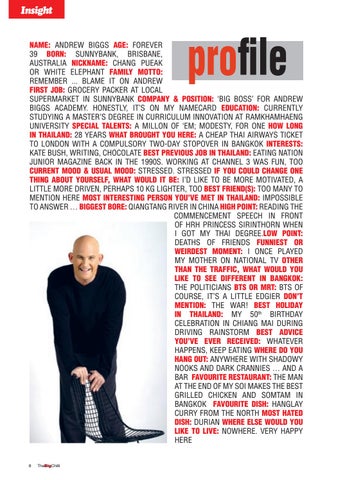 NAME: ANDREW BIGGS AGE: FOREVER 39 BORN: SUNNYBANK, BRISBANE, AUSTRALIA NICKNAME: CHANG PUEAK OR WHITE ELEPHANT FAMILY MOTTO: REMEMBER ... BLAME IT ON ANDREW FIRST JOB: GROCERY PACKER AT LOCAL SUPERMARKET IN SUNNYBANK COMPANY & POSITION: ‘BIG BOSS’ FOR ANDREW BIGGS ACADEMY. HONESTLY, IT’S ON MY NAMECARD EDUCATION: CURRENTLY STUDYING A MASTER’S DEGREE IN CURRICULUM INNOVATION AT RAMKHAMHAENG UNIVERSITY SPECIAL TALENTS: A MILLON OF ‘EM; MODESTY, FOR ONE HOW LONG IN THAILAND: 28 YEARS WHAT BROUGHT YOU HERE: A CHEAP THAI AIRWAYS TICKET TO LONDON WITH A COMPULSORY TWO-DAY STOPOVER IN BANGKOK INTERESTS: KATE BUSH, WRITING, CHOCOLATE BEST PREVIOUS JOB IN THAILAND: EATING NATION JUNIOR MAGAZINE BACK IN THE 1990S. WORKING AT CHANNEL 3 WAS FUN, TOO CURRENT MOOD & USUAL MOOD: STRESSED. STRESSED IF YOU COULD CHANGE ONE THING ABOUT YOURSELF, WHAT WOULD IT BE: I’D LIKE TO BE MORE MOTIVATED, A LITTLE MORE DRIVEN, PERHAPS 10 KG LIGHTER, TOO BEST FRIEND(S): TOO MANY TO MENTION HERE MOST INTERESTING PERSON YOU’VE MET IN THAILAND: IMPOSSIBLE TO ANSWER … BIGGEST BORE: QIANGTANG RIVER IN CHINA HIGH POINT: READING THE COMMENCEMENT SPEECH IN FRONT OF HRH PRINCESS SIRINTHORN WHEN I GOT MY THAI DEGREE.LOW POINT: DEATHS OF FRIENDS FUNNIEST OR WEIRDEST MOMENT: I ONCE PLAYED MY MOTHER ON NATIONAL TV OTHER THAN THE TRAFFIC, WHAT WOULD YOU LIKE TO SEE DIFFERENT IN BANGKOK: THE POLITICIANS BTS OR MRT: BTS OF COURSE, IT’S A LITTLE EDGIER DON’T MENTION: THE WAR! BEST HOLIDAY IN THAILAND: MY 50th BIRTHDAY CELEBRATION IN CHIANG MAI DURING DRIVING RAINSTORM BEST ADVICE YOU’VE EVER RECEIVED: WHATEVER HAPPENS, KEEP EATING WHERE DO YOU HANG OUT: ANYWHERE WITH SHADOWY NOOKS AND DARK CRANNIES … AND A BAR FAVOURITE RESTAURANT: THE MAN AT THE END OF MY SOI MAKES THE BEST GRILLED CHICKEN AND SOMTAM IN BANGKOK FAVOURITE DISH: HANGLAY CURRY FROM THE NORTH MOST HATED DISH: DURIAN WHERE ELSE WOULD YOU LIKE TO LIVE: NOWHERE. VERY HAPPY HERE 8