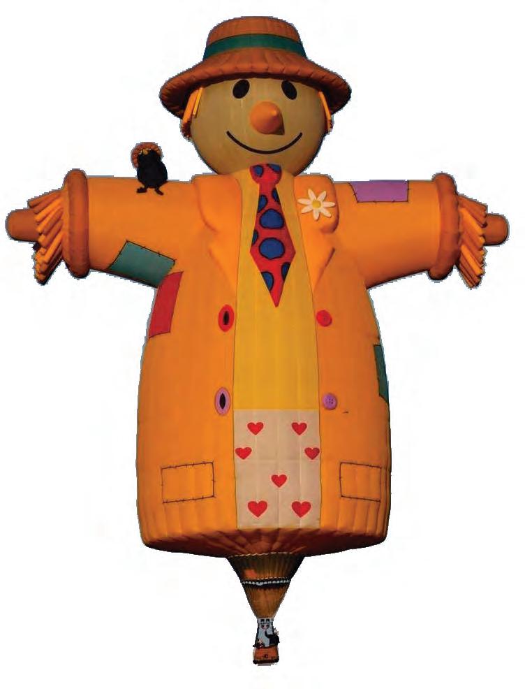 Smiley Scarecrow is 160,000 cubic feet and stands 120 feet tall. It has appeared in balloon festivals throughout the world.