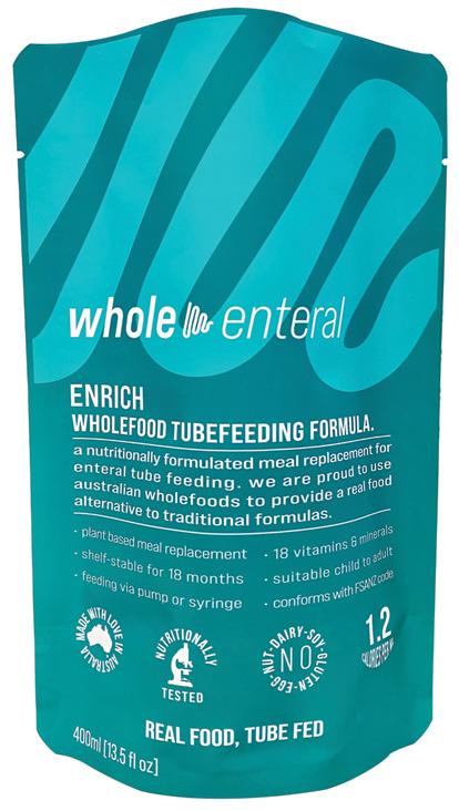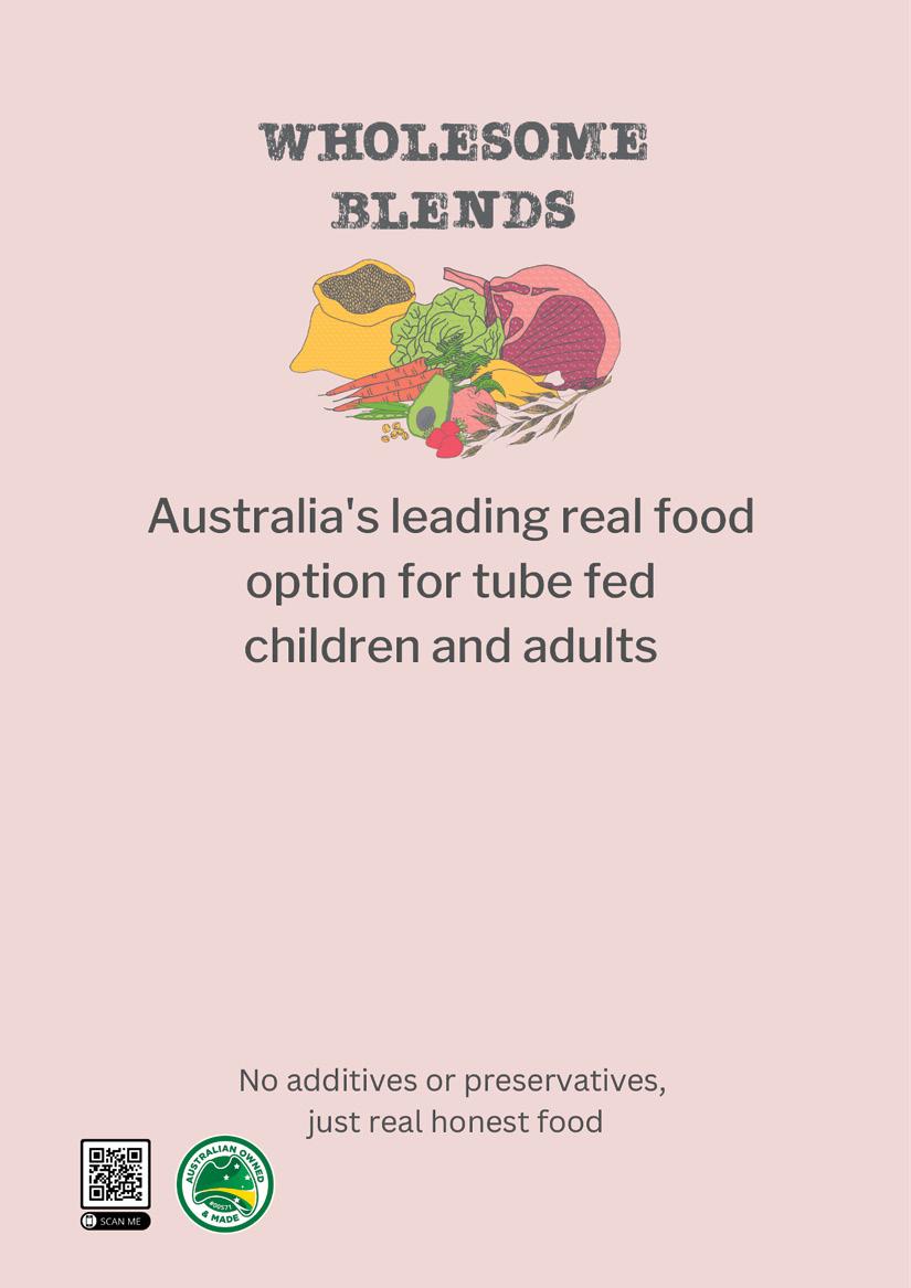 Founded by Sarah Thomas (who you can catch up with on page 24), Wholesome Blends is a maker of healthy, high-calorie meals that are a godsend for tubie families on the go. Pantry-stable and stored in a pouch, their pork, chicken and vegetarian blends have a whopping, year-long shelf-life – and Sarah’s got a range of new recipes in development. wholesomeblends.com.au @wholesomeblendsau @wholesomeblend