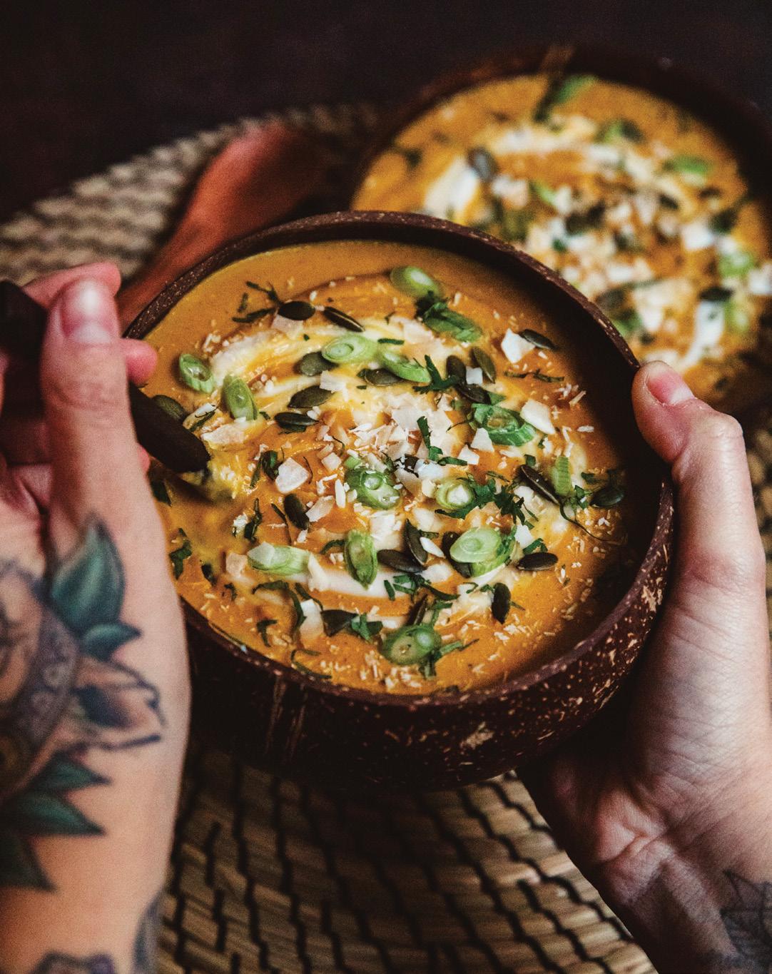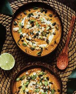 This soup is so velvety smooth, slightly spiced with cumin, coriander and ginger along with lime, tamari, coconut milk and almond butter for a Thai hint.