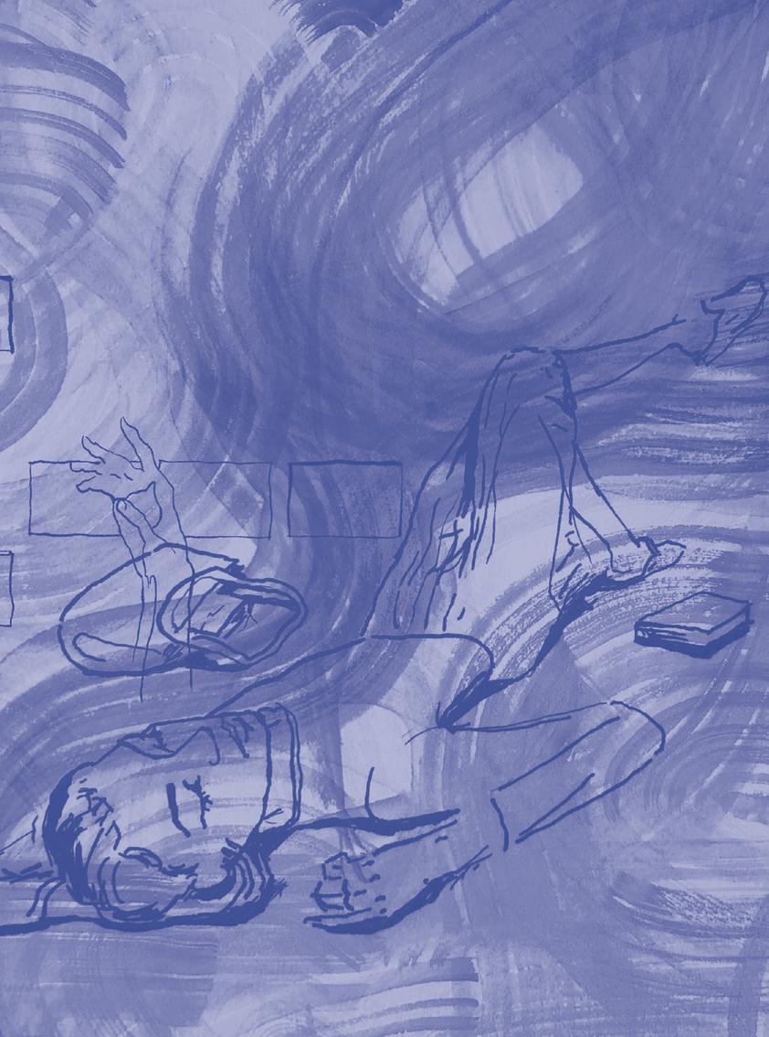 7NSOP 2022 BLUE NOTES ing joys and sorrows, a gray-haired man channels the religious pacifism of Quakers. “There is a war going on,” he says, “and it is impossible for me not to read about it and also not to be appalled and saddened, frightened, and amazed that people can behave in such a way against each other needless ly.”For an hour, I have sat in front of my laptop do ing absolutely nothing more than thinking. But, somewhat impossibly, I have been surrounded by other people, scattered across generations and all corners of Morningside Heights. Grateful for the silence we have shared, I finally introduce myself. I explain that I will be back in person in the fall to be idle, silent, and alone with my thoughts. But most importantly to do so with them—to be to gether. There was a time when I used to think that sitting in silence for an hour—let alone for 520— would have been better spent sleeping, studying, or eating a cheesesteak. But older now, having experienced a pandemic’s worth of intense phys ical isolation, returning to Quaker meeting has convinced me that everyone deserves time to be communally idle. Illustration by Hart Hallos and Oonagh Mockler