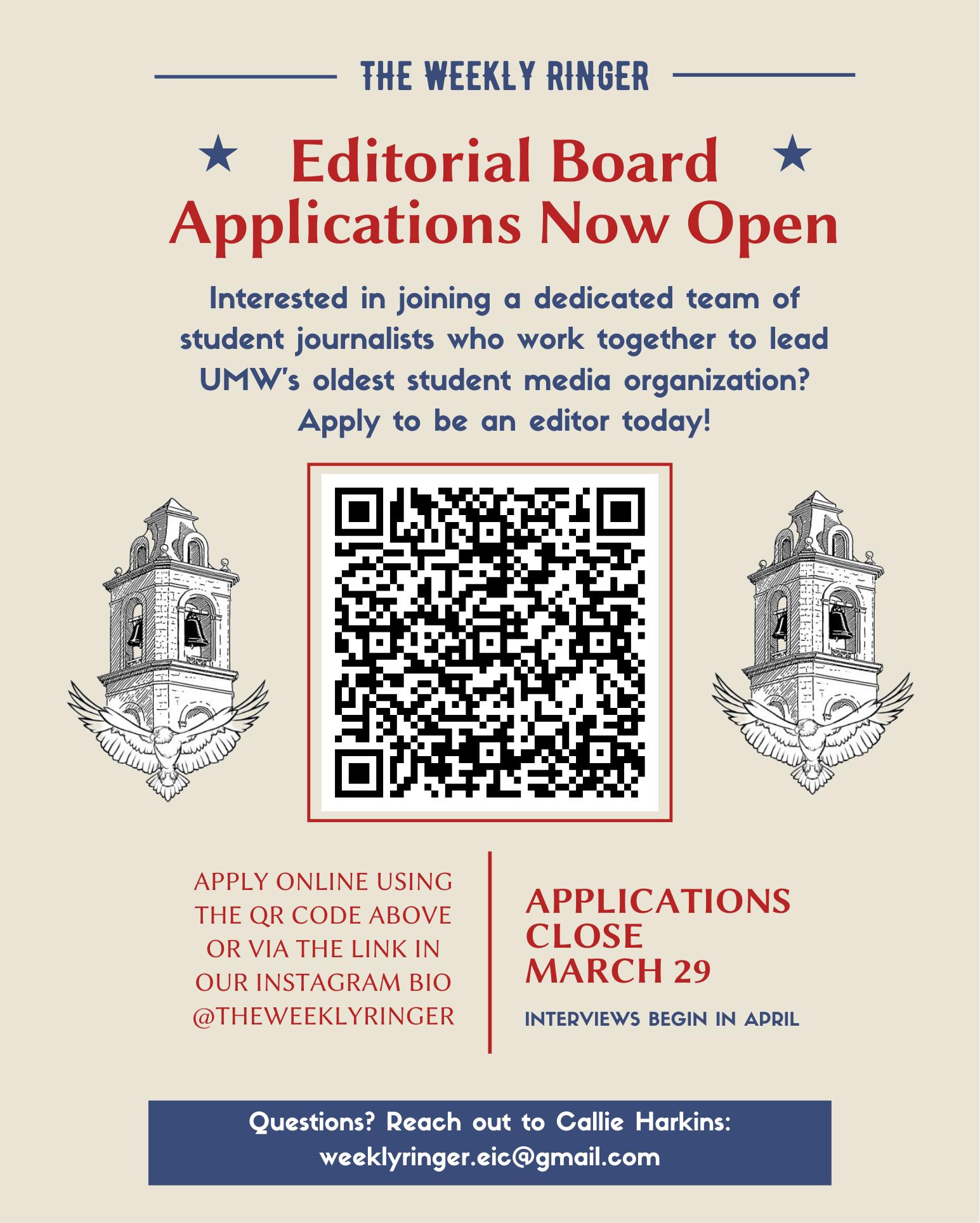 Please directs all advertising inquiries to Callie Harkins at weeklyringer.eic@gmail.com. weeklyringer.eic@gmail.com ssubrama@umw.edu