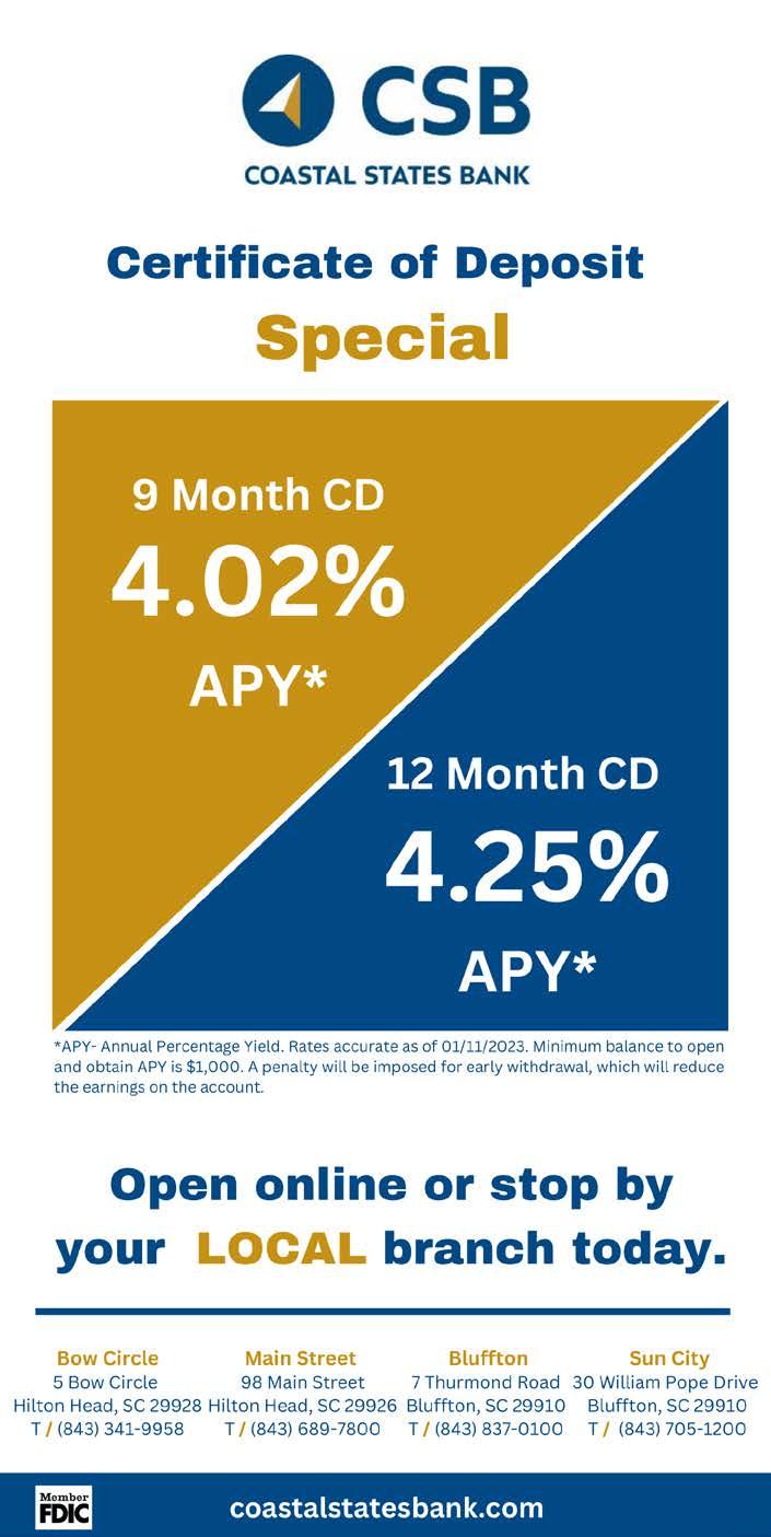 WE CLEAN • SCREEN ROOMS • SUN ROOMS • CONCRETE SURFACES Free Estimates • (843) 522-3331 • CHSCLEAN.COM LOCALLY OWNED & OPERATED SINCE 2005 Opening in MARCH!– OUR NEW HILTON HEAD LOCATION At 45 PEMBROKE Drive • hilton head island BLUFFTON + HISTORIC PORT ROYAL + HILTON HEAD ISLAND + CORNERPERK.COM Register online @ cornerperk.com/my-account to be kept up-to-date on all the latest news and information! Feb. 1, 2023 The Bluffton Sun Page 3A SUNNY SIDE UP