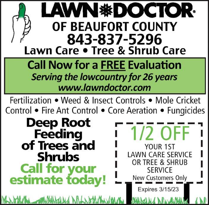 Feb. 14, 2023 The Bluffton Sun Page 43A Shreck’s HANDYMAN SERVICE SMALL JOB SPECIALIST Licensed & Insured Serving The Lowcountry For Over 7 Years Rick Shreckengost 843.540.2944 Shrecks22@gmail.com Bluffton, SC 29910