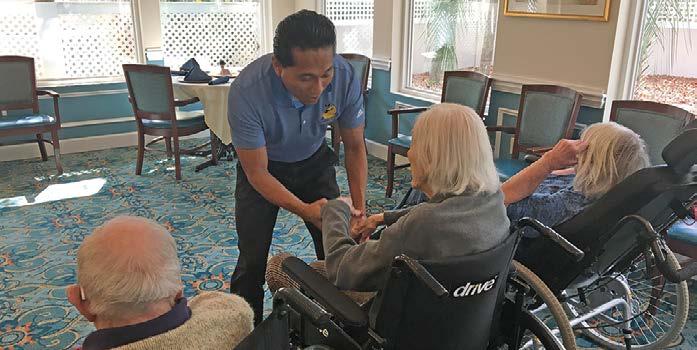 Armando Aseneta greets residents of the Cypress in the Preston Health Center on Hilton Head Island. He visits regularly and offers an adapted dance program for those who are interested.