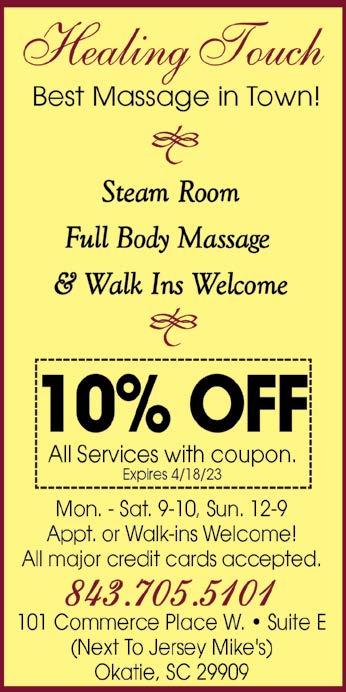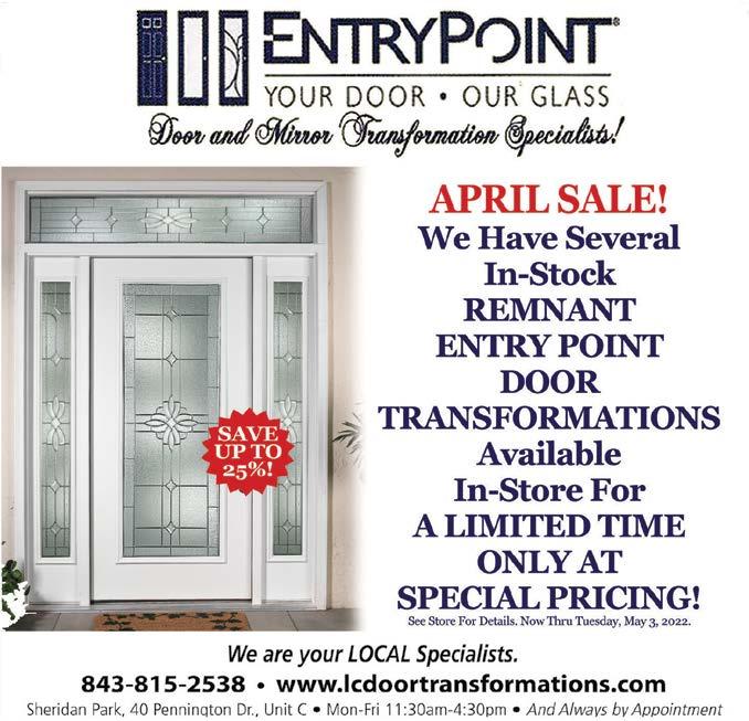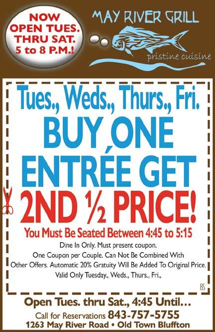 April 4, 2023 Page 9B Reservations Strongly Recommended 17 Harbourside Lane • Hilton Head 843-785-5517 • www.bistro17hiltonhead.com Early Diners Save on Your Entrée with a Complimentary Glass of House Wine! Dine In Between 5 – 5:30 PM Monday – Saturday and Save 10% off Your Entrée & Enjoy Wine on Us* Waterfront Dining at it’s Best! *Dine in only. Must be seated and ordered by 5:30pm. Offer expires 4/30/23. Cannot combine with any other offers.