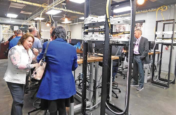 Filled with computer work stations and racks of electronic gear, the former Bridges Preparatory School in Beaufort now sports an industrial-gray décor with wall-mounted large-screen monitors for use by cybersecurity students learning how to prevent cyberattacks.