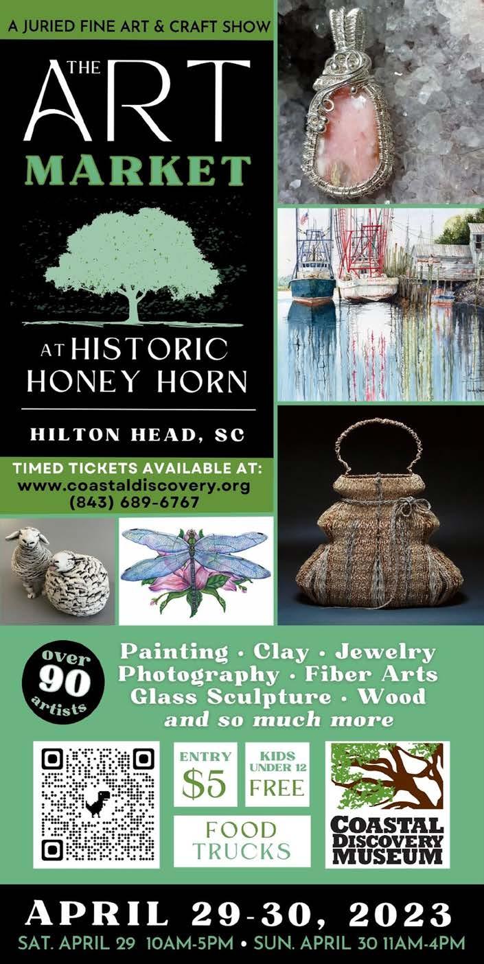 April 4, 2023 Page 11B 13 Harbourside Lane #2-H Hilton Head Island 843-785-6424 • Nashgallery.com FREE ADMISSION TO Fine Art & Craft Festival is Sponsored by Nash Gallery in Partnership with Palmetto Dunes Resort and Shelter Cove Merchants Association. HILTON HEAD ISLAND’S 14TH ANNUAL ART FESTIVAL May 27 10am-6pm May 28 10am-4pm Rain or Shine